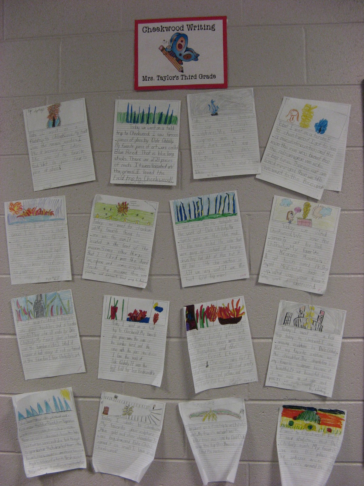 All projects were created by third grade students. Projects included organic shape paintings on canvas, collaborative chandelier, ikebana flowers, and diffuser paper macchia. Third grade students also created individual writing pieces and a classroom shared writing piece after their visit to Cheekwood. These are posted in the front hallway next to the "Chihuly at Cheekwood" bulletin board. After visiting Cheekwood today, Fourth grade will begin three different projects to be uploaded soon!